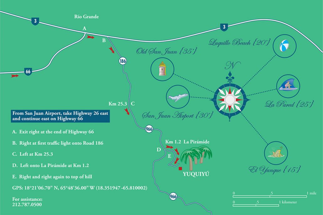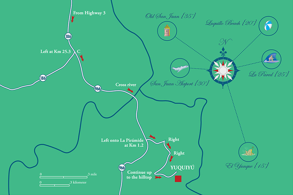 Directions: Yuquiyú is in a rural location without a street address. If you use Google Maps, be sure to select “Yuquiyú Treehouses” or use the following link: Yuquiyú Treehouses. You can also find us by using the maps and directions below. Travel time from the San Juan International Airport is 30 minutes. If you prefer the Scenic Route Along the Ocean, travel time is 55 minutes.